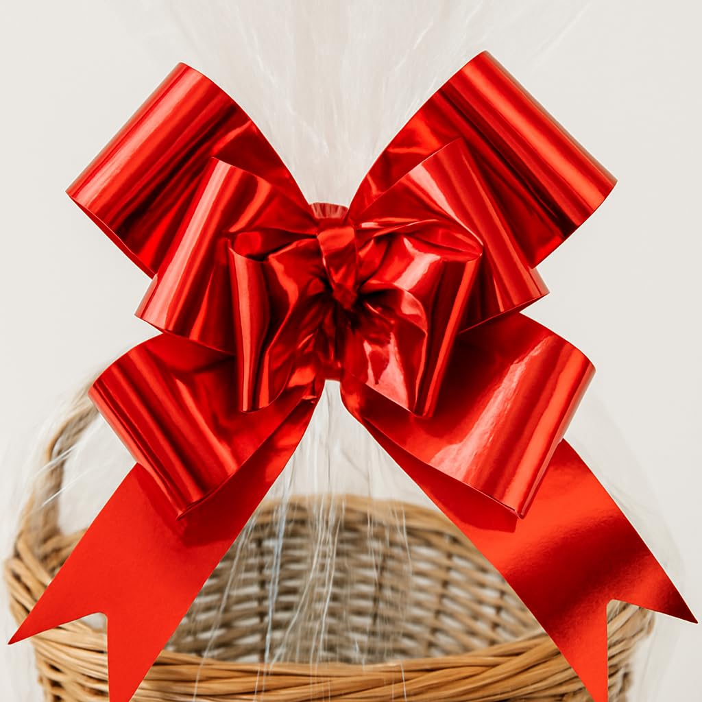 - 🔧 Easy to Use – Simply place your gift inside, gather the top, and tie with the included pull bows for a stylish and hassle-free gift wrap. (Basket not included).